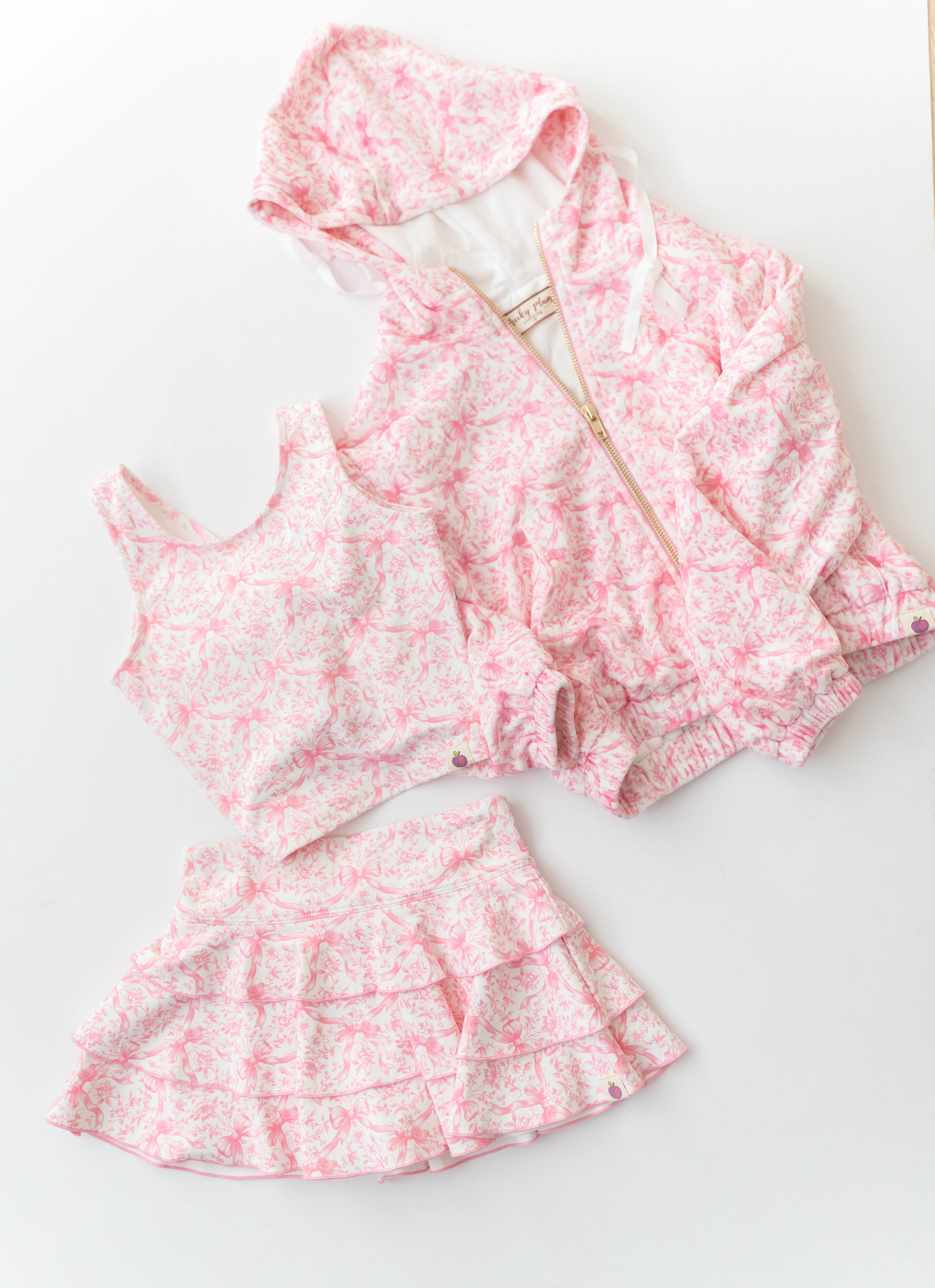 Boost her active style with the Active Tank - Heirloom Rose, a vibrant pink top covered in playful bow and floral patterns for a fun, girly look! This comfy sleeveless piece is perfect for playtime or layering, keeping her cool and cute. A delightful choice for her energetic days!