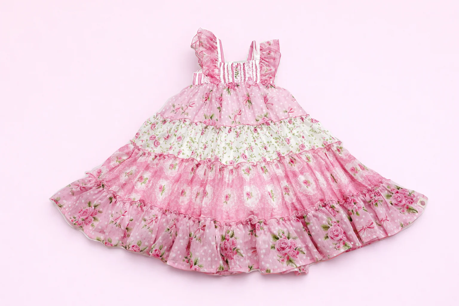 Brielle Shimmer Dress - Cupids Garden, a whimsical wonder of layered pink chiffon tiers blooming with polka dots and rosy prints for that ultimate girly glow! This sleeveless stunner, complete with fluttery straps, invites endless garden giggles and graceful spins. The perfect pick to let her bloom in bubbly, carefree style!