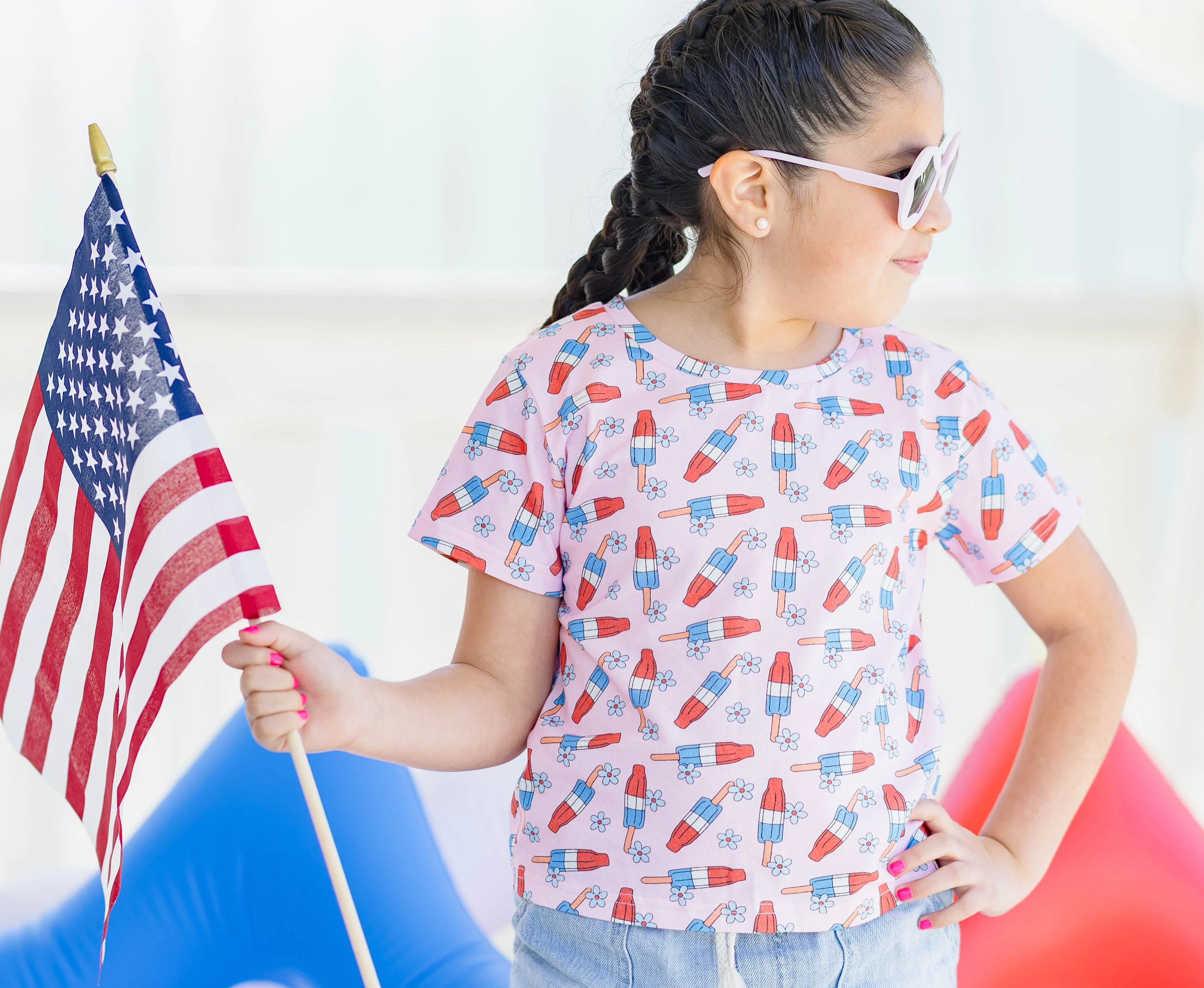 Indulge in summer sweetness with our Graphic Tee - Bomb Pop Bliss. This cute pink tee features an all-over Bomb Pop popsicle print, perfect for celebrating the season. A must-have for any girl looking for a fun and playful addition to their wardrobe. Get yours now!