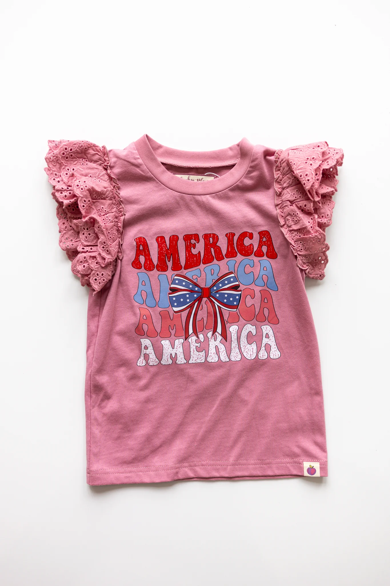 Get ready to show off your love for the USA with our Vintage Eyelet Tee - Heart of America! This adorable pink tee features eyelet ruffle sleeves and a graphic text of America with a bow print in patriotic red, white, and blue. The cutest way to express your patriotic pride!
